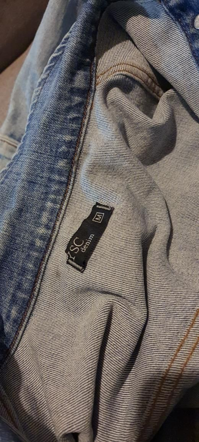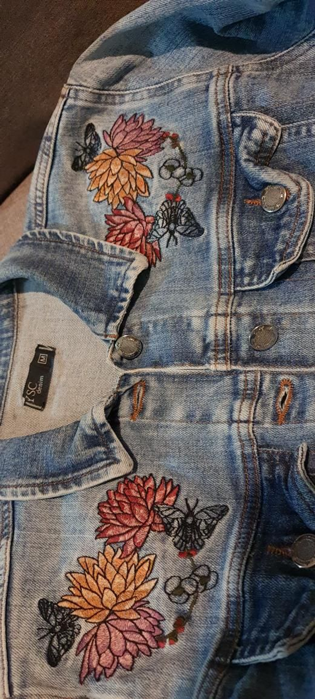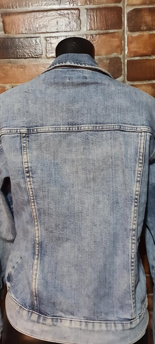 Jaqueta jeans, manga longa. T/M. OBS: usada em perfeito estado