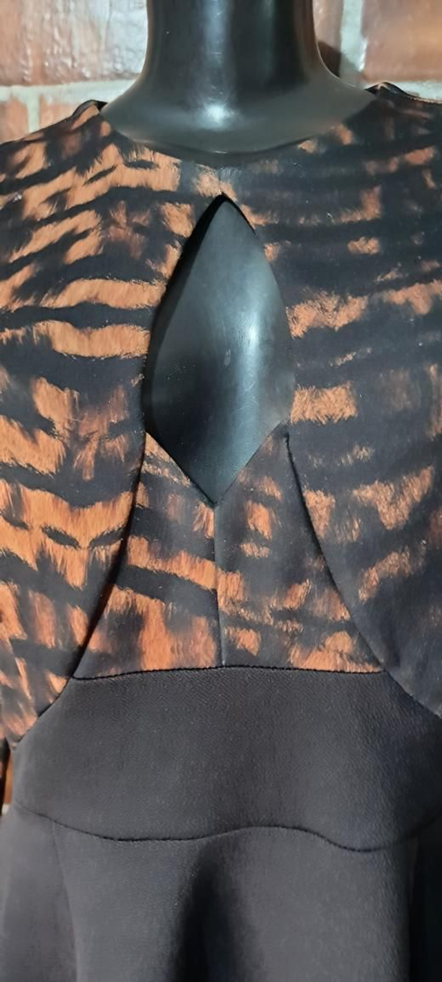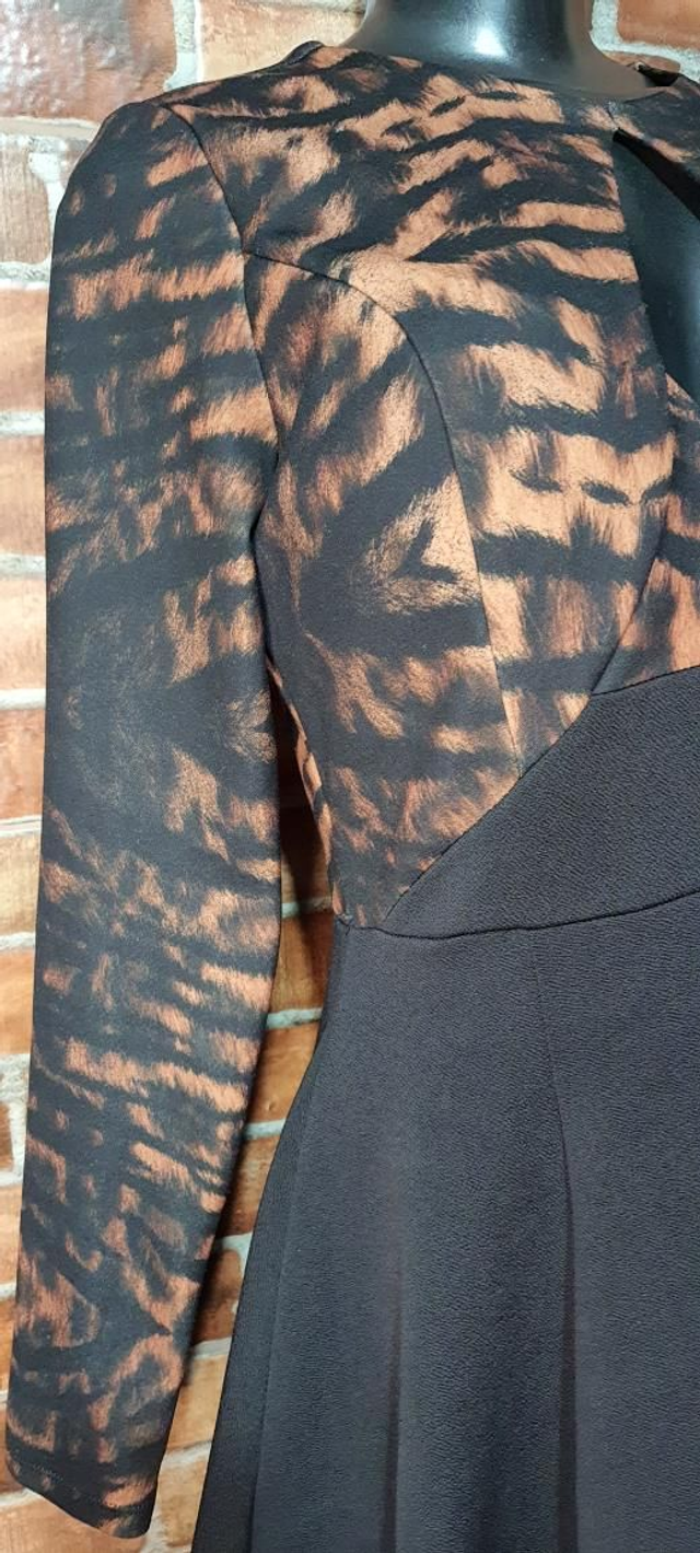 Vestido preto com estampa de onça, com manga longa. OBS: usada super conservada, T/M
